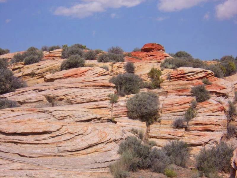 Hike: Loop de wash in Volg deze korte tijd. Niet veel later start de Draw met een enorme dryfall met eronder een gevulde pothole. Hier kun je niet af. Loop nu links boven langs de canyon. Daar is een smal pad. Als je dat volgt zie je na circa 5 minuten cairns langs het pad en rechts iets verder op ook cairns. Hier is een redelijk eenvoudige afstap de canyon in. Verken de canyon naar beide zijdes want overal mooie vormen, slot delen, dan weer open stukken. De kans dat je potholes met water tegen komt is aanwezig. Kijk of je ze kunt doorwaden. Neem een stok om de diepte te bepalen. Het kan goed zijn dat het op gegeven moment niet meer gaat. Je kunt dan de canyon weer uit gaan en het pad bovenlangs nog eens circa 25 minuten volgen totdat je bij een Fork, aftakking, komt. Ook daar kun je eenvoudig de zijcanyon in en dan de canyon verder verkennen.