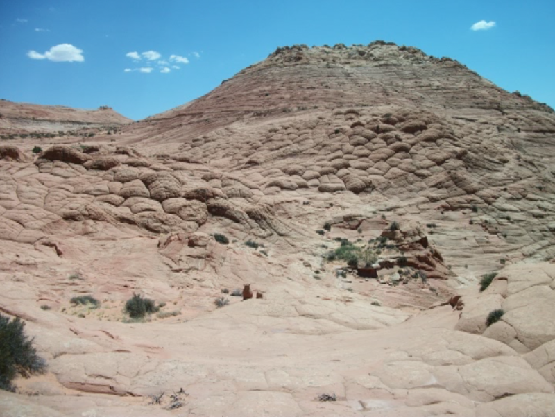 Hike: van boven af zie je een wash. Ga die in en volg deze in zuid oostelijke richting. Je kan ervoor kiezen om beneden door de wash te lopen, je kan op diverse plaatsen ook een pad aan de bovenzijde volgen. Het pad aan de bovenzijde snijdt de bochten van de wash af, dit is dus iets korter. Als je aan de bovenzijde loopt heb je wel iets meer met kleine hoogteverschillen te maken.